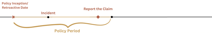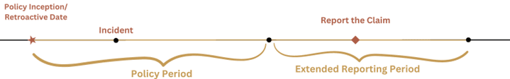 The diagram below illustrates how the policy period works, showing that coverage applies only if an act, error, or omission occurs and is reported to the carrier within that timeframe.